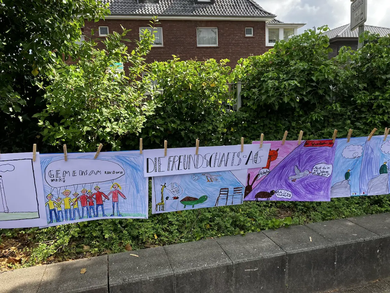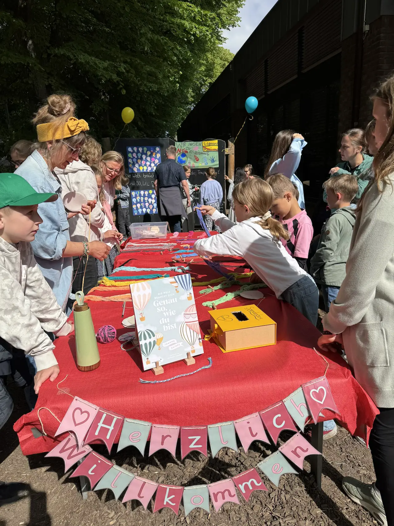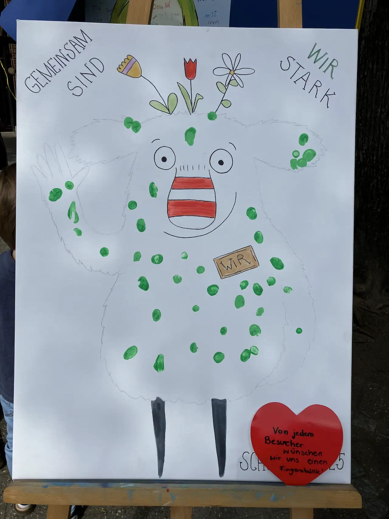 Schon beim Betreten des Schulhofs wurde klar: Hier passiert etwas Schönes. Es roch nach frisch gebackenen Waffeln, überall gab es etwas zu entdecken, und die Kinder waren mit Begeisterung bei der Sache. In kleinen Gruppen arbeiteten sie an ganz unterschiedlichen Projekten – kreativ, sportlich, sozial. Und das Ergebnis konnte sich wirklich sehen lassen: Der Schulhof wurde zur bunten Ausstellungsfläche mit Plakaten, Mitmachstationen und tollen Ideen. Besonders stolz sind wir auf die leuchtenden Zaunstifte, die nun unsere Schule schmücken und schon von Weitem zeigen: Hier halten wir zusammen.